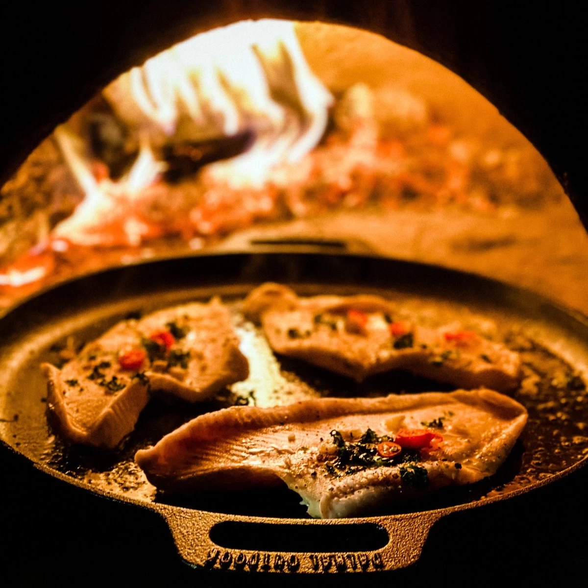 Een skillet van Valhal Outdoor die door zijn lage rand ook nog eens als bakplaat/plancha gebruikt kan worden. Een droom die uitkomt! Door de twee handvatten kan je de skillet gemakkelijk verplaatsen, vooral als je de bbq handschoenen van Valhal Outdoor gebruikt (VH.GLOVES).